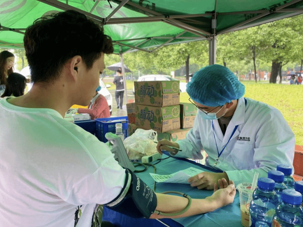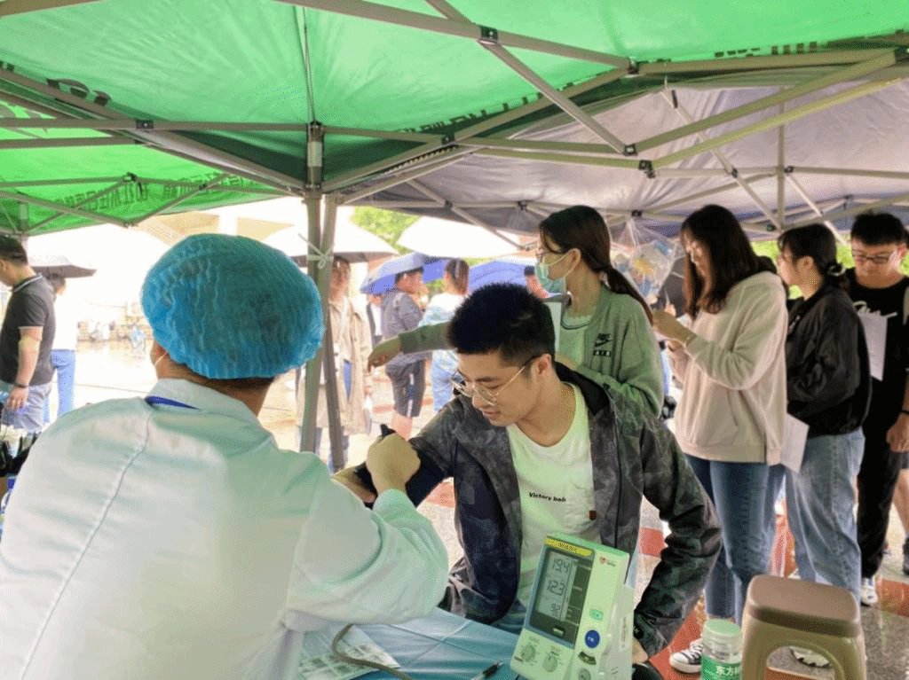 武汉血液中心的医生为同学们仔细地讲解献血的具体流程和第一次献血的注意事项。为了保证献血志愿者的安全,医生们经过严格的献血检查和初筛后才让大家登记排队。看到结伴相约来献血的同学们在帐篷外排起了长队,一位女医生主动加入了党支部志愿者的队伍里,和他们一起维护现场的秩序,引导同学们有序献血。