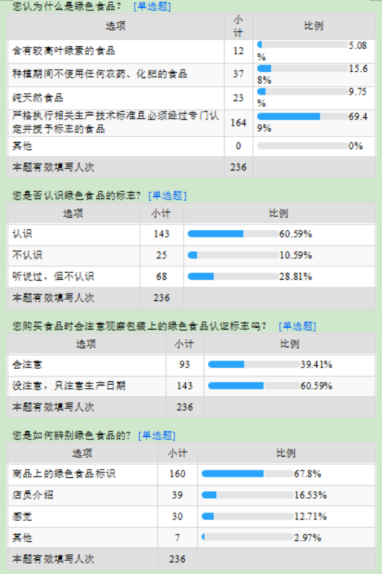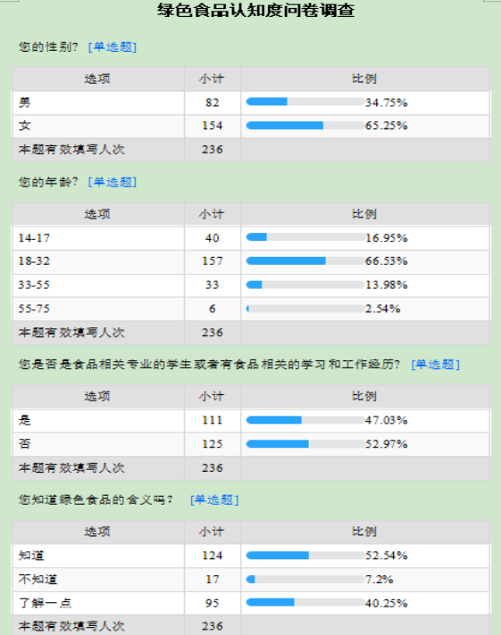 2月6日以来,以徐宁宁、郭若彤、黄圣凯、林聪聪为成员的绿色食品“代言人”实践团面向广大市民朋友,开展了一场绿色食品认知度的调查问卷,调查对象涵盖年龄段在14-17、18-32、33-55等236人次,其中有食品相关专业的学习或者工作经历占比111人,没有食品相关专业工作经历的占比125人。问卷调查主要考察广大市民朋友绿色食品的概念和理念、绿色食品的标志、绿色食品的购买意向、了解绿色食品的途径以及对绿色食品的期望。