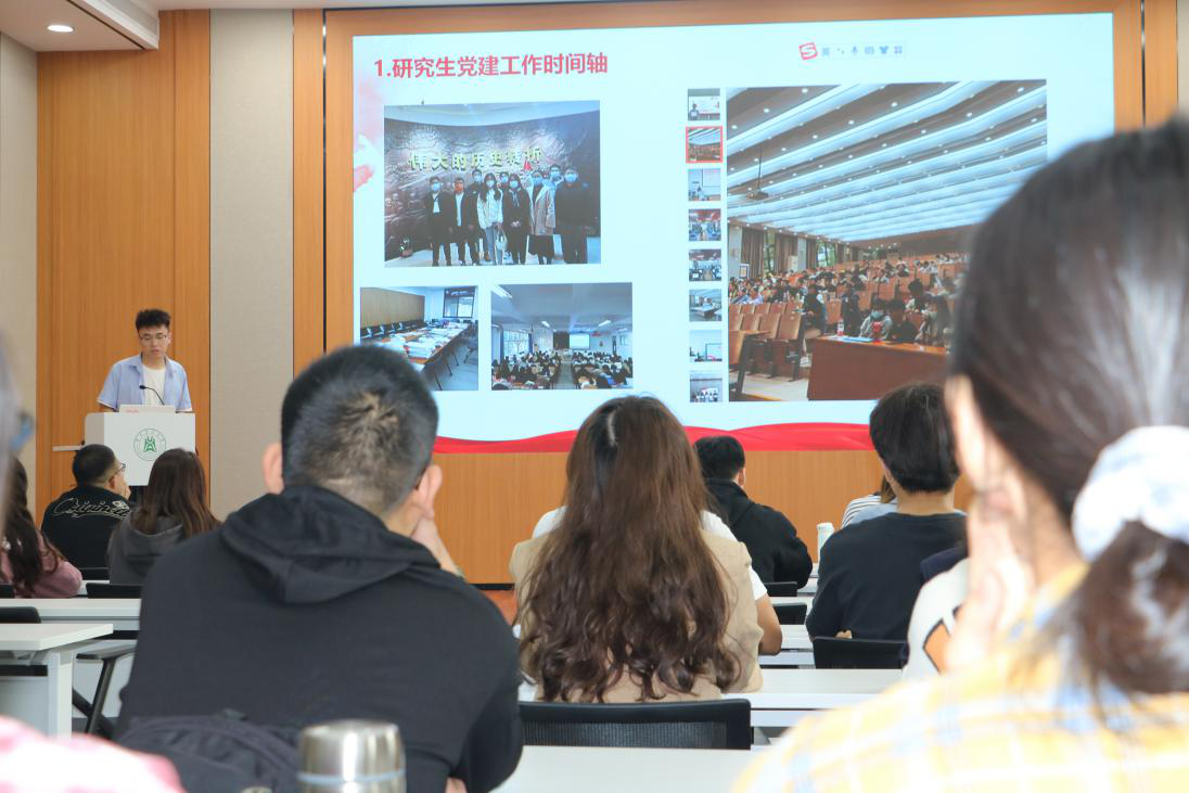 会议伊始,由2022届学生骨干对过去一年党建办、团工委以及研究生会的工作内容进行总结汇报。首先,2022届党建办主任梁一豪为我们介绍了去年一年的工作经历以及经验分享。他提出了三个感谢和一个展望。感谢yl23411集团对研究生育人工作的重视,感谢学院构建的学生工作平台给予我们锻炼的机会;感谢上学年一起工作努力的党建办全体成员;感谢党团学大家庭给予我们的温暖,对党建工作大力支持配合。希望下一届的学生骨干更加团结,工作水平迈上新的台阶;敢于作为,善于作为,主动作为,奋发有为,勇于创新,开创新的工作模式与活动开展体系。接着各个部门的部长依次进行了总结汇报。大家主要从学年工作内容、活动创新、心得体会、未来寄语等方面介绍了党建和研会的工作,分别展示了“微党课比赛”、“舌尖上的墨香”、“21天打卡活动”、“重温百年史诗”读书分享会、“狮子杯”篮球赛等一系列特色活动,在食科院师生中受到一致好评。最后,研究生会主席罗依婷对过去一年的工作进行了小结。她分别从五个方面对研会工作进行了剖析,研究生会不仅要热爱工作,也要服务、立足于同学,保障同学们的生活权益,要做到德智体美劳全面发展。她也为新一届届研会提出了五词建议:主动、落实、团队、师生、感谢。“2022届学生工作的顺利完成离不开学院老师的帮助,离不开部门成员之间的团结合作,也离不开部门之间的互帮互助。希望新一届师弟师妹能继续团结一致,紧密合作,同时不拘泥于上一届活动内容,敢于创新,共同将食科院建设的越来越好。”