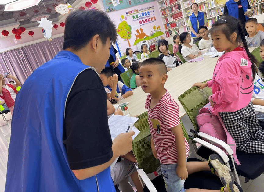 志愿者裴丽娜在和小朋友们一起做实验-奚俊