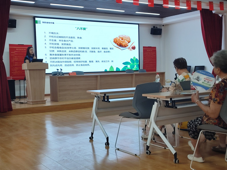 “大家都知道生活中食物中毒的现象有很多,发芽的土豆,未煮熟的四季豆等等都会让我们产生肠胃的问题,但大家知道如何来预防食物中毒吗?”胡雪芹讲道。台下部分观众表示:“老年人平时生活比较节俭,存在一些把发芽土豆继续使用,腐烂果蔬挖去腐烂部位继续使用的现象,平时都不在注意食物中毒的预防。”对此,胡雪芹讲解道:“食物中毒主要有发病急、无传染性和季节性的特点。主要分为细菌性食物中毒和有毒动植物的中毒两类,我们想在生活中起来预防作用,就要做到‘八要’和‘八不要’。”
