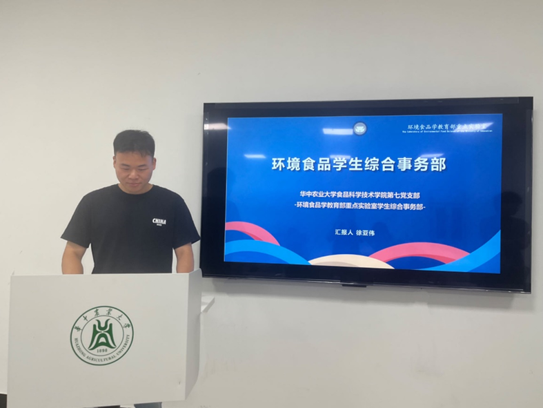 紧接着是我院学生组织体系的介绍,首先由党建办主任宋咏恬向大家介绍食科院党建办具体情况。学院研究生党建办公室是在学院党委指导下和研究生辅导员领导下的协调办事学生组织,是学院党委和各培养层次研究生党支部之间沟通的桥梁和纽带。每月常规工作有党日活动的通知、流动走进每个支部的党日活动并进行学习、党日活动材料的收集和整理等。除此之外,还介绍了特色活动概况。研究生会主席方悦霓介绍研究生会的具体情况,学院研究生会以服务广大研究生为宗旨,坚持以爱国成才引导同学、以切实行动代表同学、以全心全意服务同学、以丰富活动发展同学,充分发挥研究生会"学生之家、师生之桥、干部之校"的作用。最后,环境食品学生综合事务部徐亚伟介绍事务部的具体情况,该部门2018年入选首批高校“百个研究生样板党支部”创建名单,作为首批全国党建工作示范高校、标杆院系、样板支部,一直坚持发挥党支部的主体作用,充分发挥食品专业特长,逐渐形成了支部独特的“食研文化”,旨在培养出一批又一批“理想信念坚定,学业成绩优异,带头作用凸显,师生高度认可"的研究生党员。