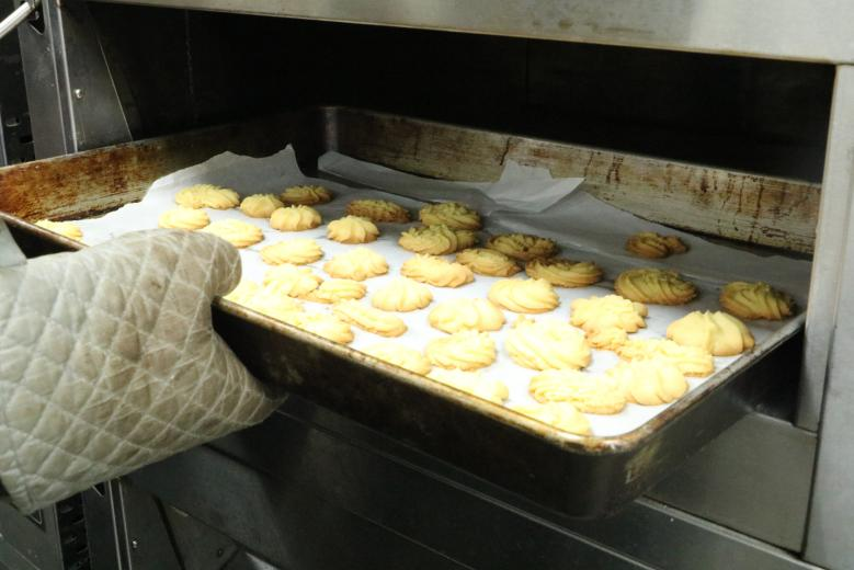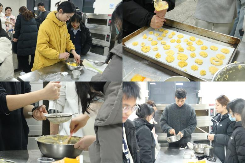 随后,学生骨干们进行分组制作,每个小组配备烤盘、原料和烘焙工具。在工作人员的帮助下,有的小组选择了传统的圆形曲奇饼干,有的则尝试了心形、星形和动物形状等各种多样的设计。除此之外,为了制作出更加健康的饼干,部分小组选择减糖制作,科学调整原料配比。改良版曲奇经过烤箱的烘烤,同样散发出诱人的香气。