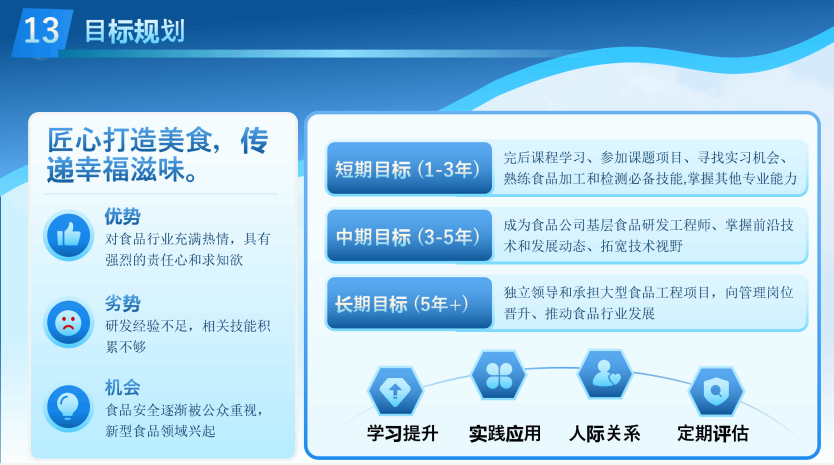 食研2405班的严若涛,在服兵役期间对战备食品产生了浓厚兴趣,立志成为一名杰出的食品研发工程师。他详细阐述了自己在科研领域与社会实践方面的优势,同时表达了对食品研发方向的深刻认识,并据此制定了明确的职业规划。严若涛正以饱满的热情和不懈的努力,朝着自己的梦想稳步前行。