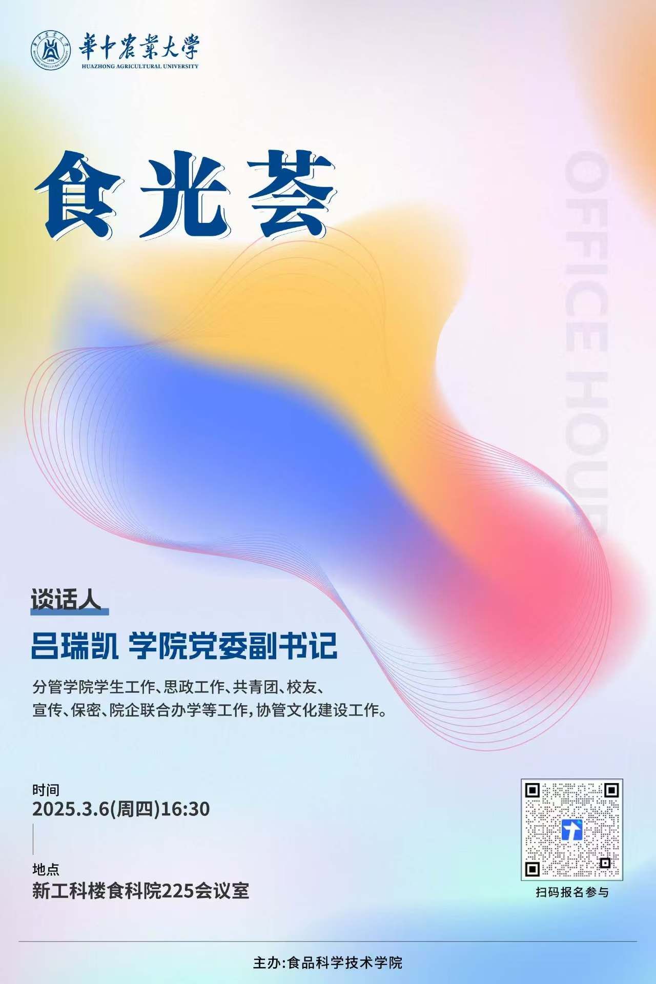 yl23411集团首期“食光荟-与院领导面对面”交流活动即将举办,本期活动邀请学院党委副书记吕瑞凯作为主讲嘉宾出席。“食光荟-与院领导面对面“这一活动旨在搭建学院常态化交流平台,后续将定期邀请不同院领导参与交流。