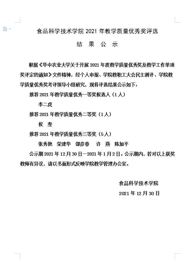 学院2021年教学质量优秀奖评选结果公示