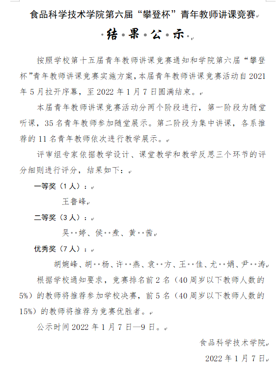 学院第六届“攀登杯”青年教师讲课竞赛结果公示
